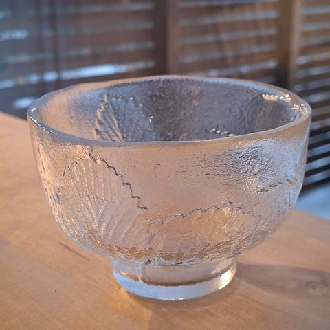 Det er litt ujevnt langs kanten, antakelig fordi det er håndlaget. Motivet virker som om det er frest eller etset inn. Fra Kosta Boda?