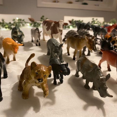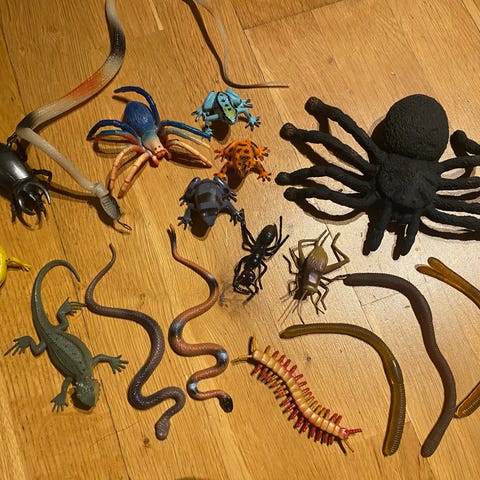 Dinosaurleker sett med flere dinosaurfigurer i ulike farger og størrelser. Laget av solid materiale egnet for barn. 6 stk. Saloflaske for å vist str.