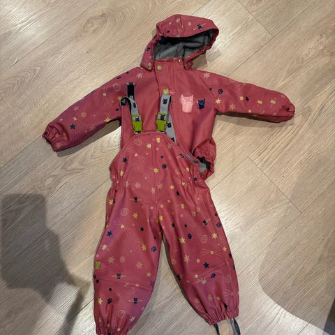 Plask regntøy fra Kattnakken. Kjøpt brukt av meg og brukt et fåtall ganger i høst 😊 Den er litt møkkete, vi har kun tørket av den, men er sikkert mulig å få den renere. Ellers ser jeg ingen mangler.
