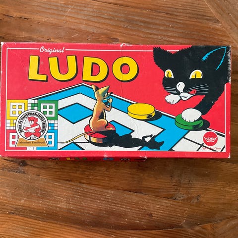 Ludo brettspill med fargerike brikker og spillbrett. Inkluderer spillregler og er egnet for flere spillere.Alle brikker følger med og en terning.