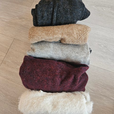 2 bukser, pysjshorts, strikkegensere, topper osv