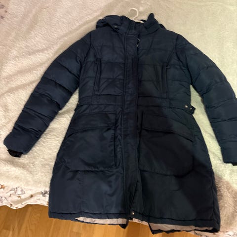 Str. 140. Svart lang varm polstret kåpe med høye splitt i sidene. Reflekterende detaljer, frontlommer med glidelåslukking. Beskyttende avtakbar hette med sølvfarget fôr. Vann- og vindtett som er varmt polstret. Polstret krage og avtakbar/justerbar hette