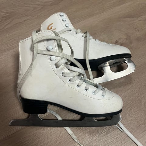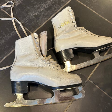 Justerbare skøyter i størrelse 34-37 for barn. Skøytene er svart og hvite og er ikke slipt på en stund, men det kan man fikse på de fleste skøytebaner for en rimelig penge.