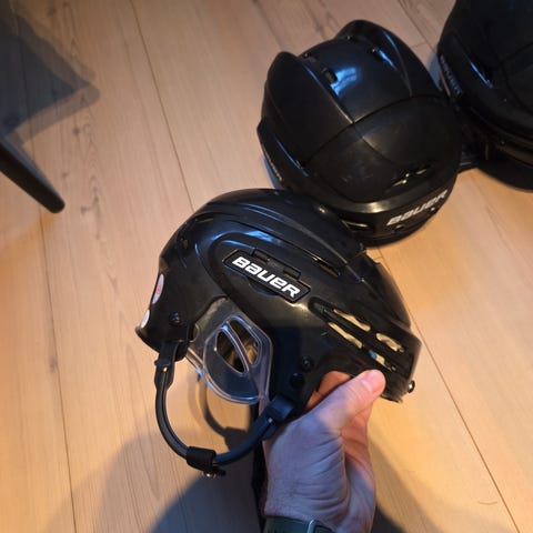 Bauer hockey/ bandyhjelm med gitter. Tror det er størrrlse S. Er brukt av 10-12-åring