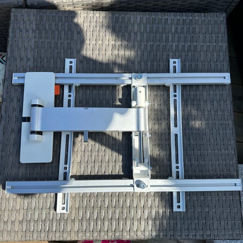 Justerbart veggfeste i hvitt metall for TV eller skjerm. Designet for å kunne tilpasses ulike størrelser og vinkler, egnet for montering på vegg. Passer for bruk i hjem eller kontor. Passer for skjerm opp til 55". Ny pris kr 2500.