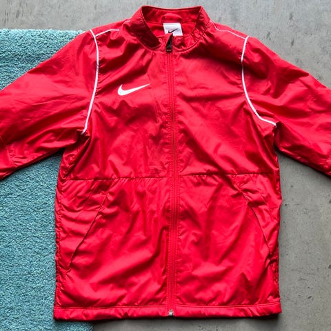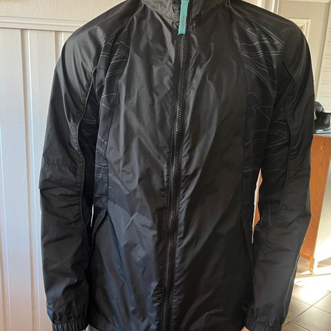 Selger en svart Adidas regnjakke brukt som treningsjakke på våte dager på fotballbanen. Den der trykket med OBOS akademiet og Adker fotball, samt initialer. Størrelse 140/9-10 år.