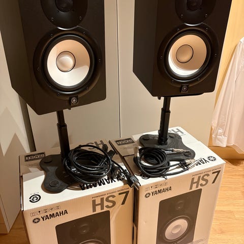 Yamaha HS5 studiemonitor med svart kabinett og hvit basshøyttaler. Designet for presis lydgjengivelse i studioinnstillinger.