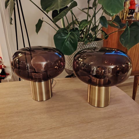 Stilrene pendellamper fra Bohus. Én i bronsefarget glass og én i sotet glass.