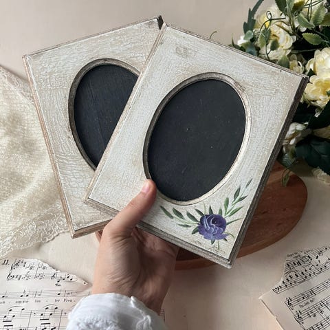 To vakre bilderammer i porselensaktig materiale, dekorert med håndmalte blomster og en rød rose nederst. Perfekt til små bilder, portretter eller som pynt i en hylle. Uten glass. Selges samlet for kr 320,-. 🌹