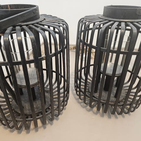 Skeidar dekorasjonslanterner laget i svart metall. Settet består av to lanterner i ulik størrelse med håndtak for enkel bæring. Designet med åpne lameller som gir et moderne uttrykk og gir god lufttilgang til lys inni.