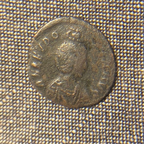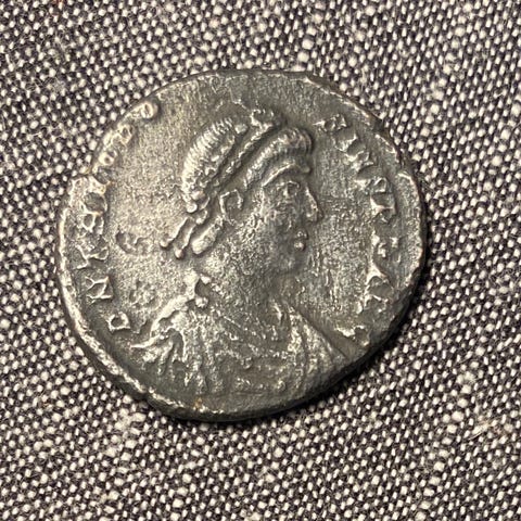 "En pen liten mynt utgitt av keiser Theodosius I. Gammel og med mye historie.