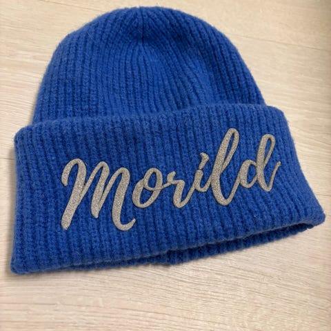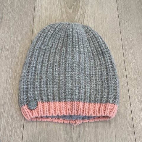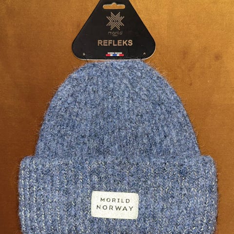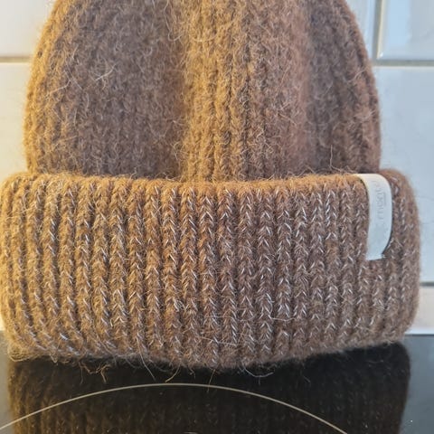 Lue i beige farge med refleks, størrelse one size. Luen har et rutemønster i strikket materiale