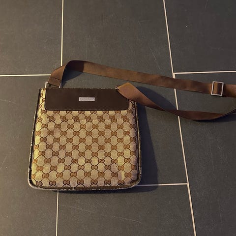 Veldig romslig. Veske med lappen på. Denne er ikke brukt, men fått et estetisk merke bak. Se bilde for detaljer og mål.