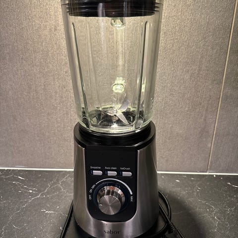 BevRev Blender er en ikke-elektrisk, bærbar smoothieblender som kan blende på 10 sekunder. Den har en gjennomsiktig beholder med måleindikatorer, et svart lokk med drikketut, og et grønt håndtak og visp. Blenderen er designet for enkel og rask blending uten behov for strøm.