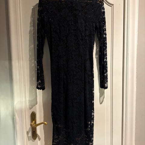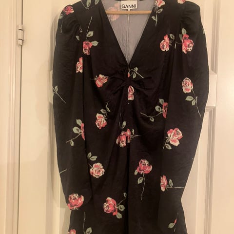 Ganni festkjole i størrelse S, farge beige, laget av polyester. Kjolen har et mønster med struktur og volanger nederst. Den har lange ermer og rund hals. Er litt stor i størrelse
