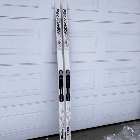 Nesten ikke brukte ski fra finske Karhu med 160 cm lengde og største bredde på 10,7 cm. Smørefrie jaktski uten stålkant, ingen hakk og sår i sålen. Breie nok til å flyte på nysnø, er som truger, men får fart nedover. 75 mm binding påmontert, det følger med godt brukte BC-bindinger som passer to av skruehullene som finnes.