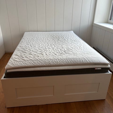 Brimnes seng fra IKEA. Sengen er 80x200. Kan trekkes ut til dobbel seng. Veldig praktisk oppbevaring under senga i den 2 skuffene.
