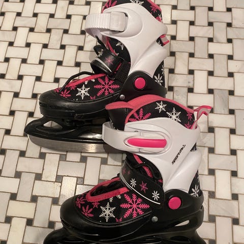 Barneskøyter i størrelse 32 med rosa farge. Skøytene er designet for barn og egner seg til generell bruk på is. Materialet og detaljer er tilpasset barnets komfort og sikkerhet.