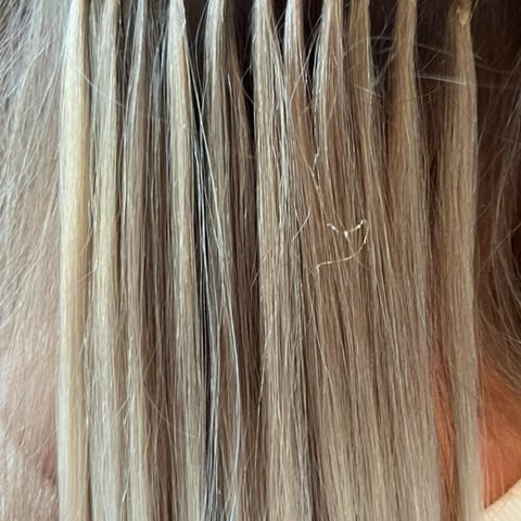 PUNDET PÅ BILDET ER CIRKA 170 GRAM. Jeg selger naturlig blondt hår, en blanding av 3 farger, men for det meste platina. Jeg anbefaler det til kvinner som har striper. MERK: HÅRET ER BRUKT. Keratinspissen trenger behandling og en hårfestetrimming, ellers i veldig god stand. Det ble brukt i 2 måneder. Opprinnelig var det 55–60 cm langt, nå ca. 50 cm langt. Håret ble alltid kjøpt på salongen der det ble satt opp. De to første bildene viser hårfargen i dagslys.