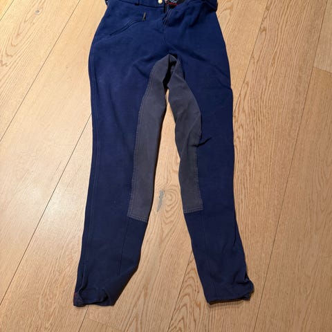 Ridebukse med blå på beina, antagelig 32 eller 34. Merkelapp borte