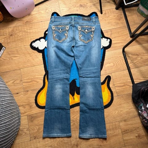 Selger miss me jeans! Størelse 27 (USA mål) de er fint brukt og blir solgt fordi de er for store for meg:) jeg er 160cm og de passer helt fint i lenge men er litt store rundt midjen, men det kan enkelt fikse om du har et belte eller syr in en strikk:)