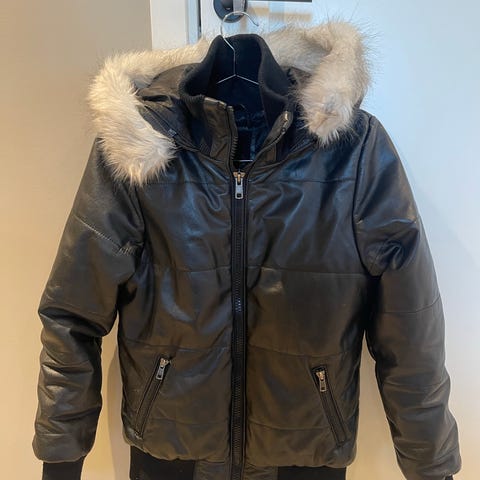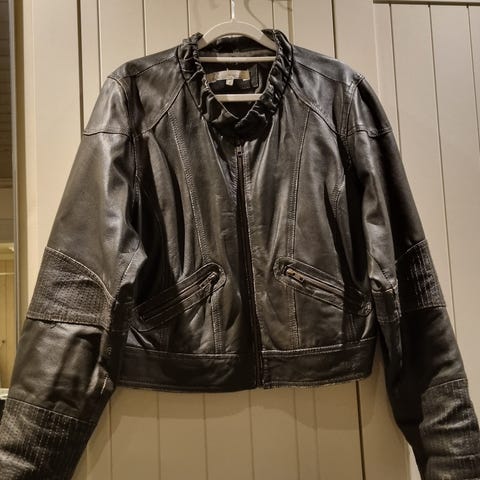 Flott skinnjakke i nydeligt mykt skinn med avtagbar krage. Kjøpt i København- brukt en gang. Kan sendes mot porto🤎