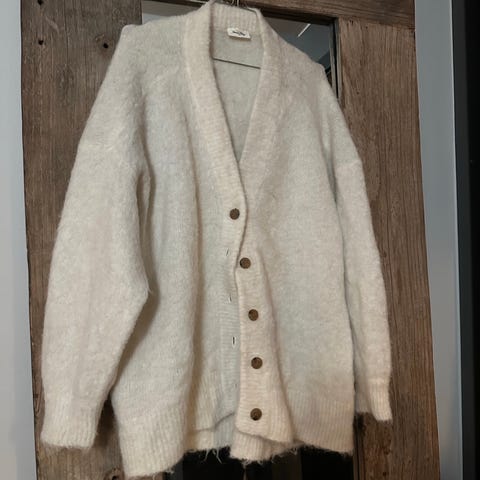 American Vintage Cardigan i ull, størrelse S, i fargen rød. Designet for kvinner, egnet til bruk som et varmt og komfortabelt ytterplagg. Opprinnelig pris 2100, men selger den for 1000