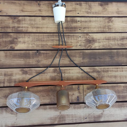 Tre fantastiske pressglass-kupler som bryter lyset nydelig, kombinert med messingfargede detaljer og treverk – ekte norsk retro.