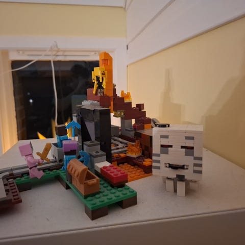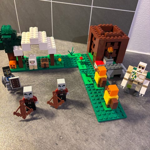 LEGO Minecraft byggeklosser med flere farger og ulike byggeelementer. Settet inkluderer en baseplate og forskjellige klosser som kan settes sammen for å lage en Minecraft-inspirert scene. Enkelte deler mangler.