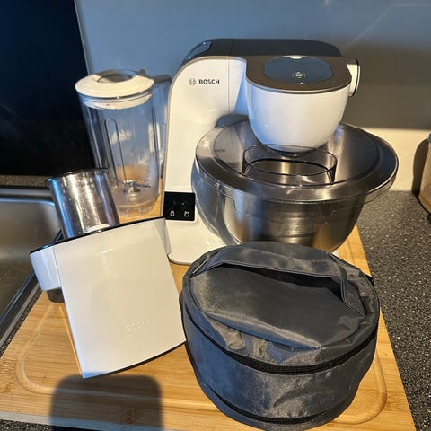 Bosch Concept 7200 kjøkkenmaskin, inkludert rustfri stålbolle, visper, eltekrok og blender. Maskinen har justerbar hastighetskontroll. Det er noen sprekker i eltekroken, men det påvirker ikke bruken.