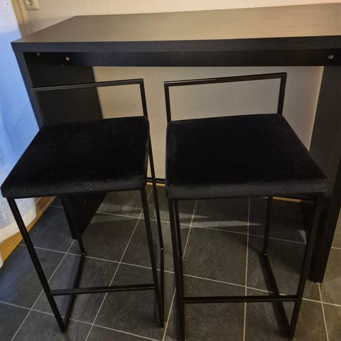 Svart barbord med fotstøtte selges pga flytting. Litt bruksmerker. Topplate helt uten merker. Selger også barstolene. Department stoler kr. 1750,- for 2 stk. Samlet sett kr. 2000,- (egen annonse for stolene)