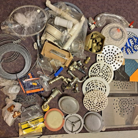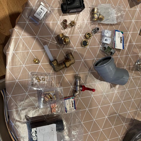Resten etter oppussingen.Sett med ulike VVS-deler og koblinger,ventiler, koblinger, og tilbehør. Materialer egnet for bruk i vann