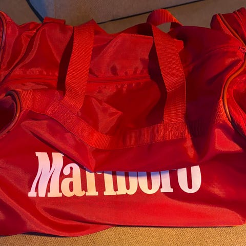 Sjelden Marlboro bag selges. Bilde og tekst på begge sider, tekst på begge ender.