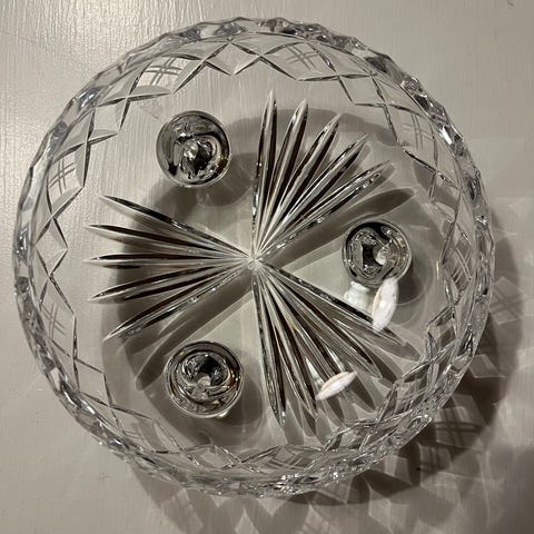 Vakker krystallskål på stett med flott mønster.