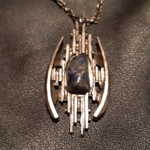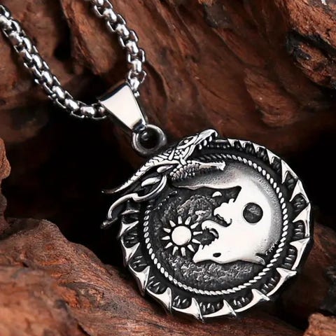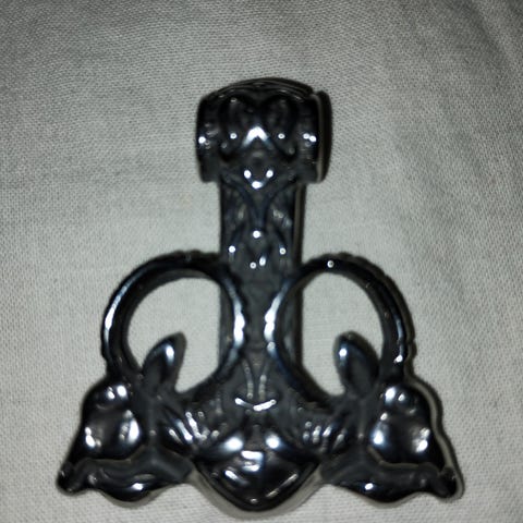 Smykke i rustfritt stål med Odin sine ravner Hugin og Munin sittende i Yggdrasil (livets tre).