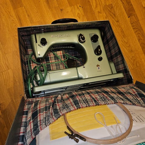 Bud ønskes: Husqvarna symaskin i grønn farge med tilhørende koffert. Maskinen har en robust konstruksjon og er designet for håndsøm og tekstilarbeid. Kofferten gir praktisk oppbevaring og transportmulighet for symaskinen. Pris kan diskuteres ved rask handel