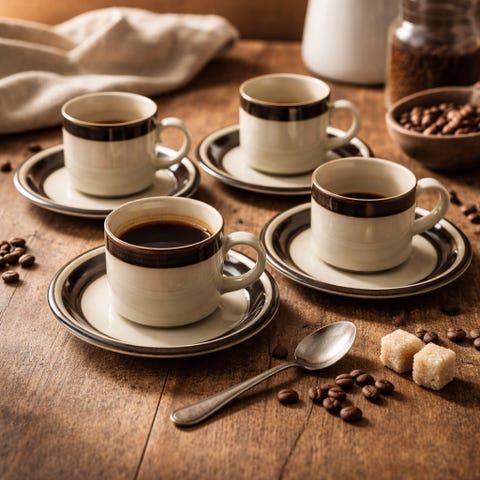 8 stk te kopper - høyde 6,8 cm - diameter 7,5 cm. De er nokså små til være tekopper, men det er tekopper. Kaffekoppene i samme serie er mindre.