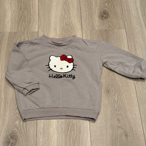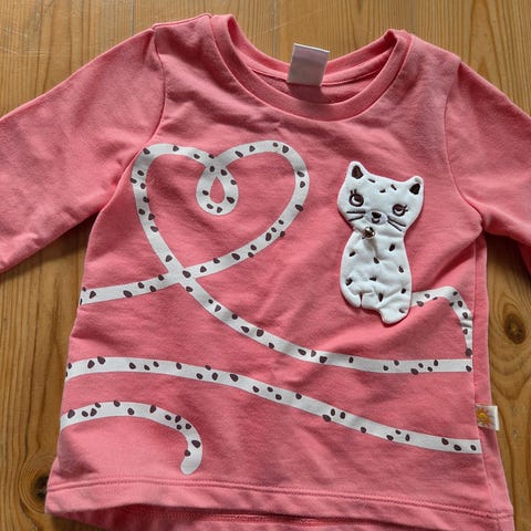 Veldig søt og pusete genser med kattemotiv, str 98. Den er ganske lang, nesten som en kjole. Pent brukt, kan ikke se noen flekker eller skader.