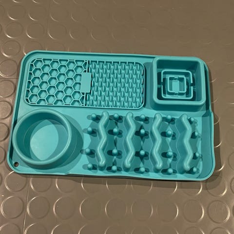 Hjerte slowfeeder med slikkematte på baksiden som er pent brukt, den har litt vannmerker men ellers helt fin. Størrelse 21 x 3,9 cm. Selges for 100 kr. PRIS ER SATT!