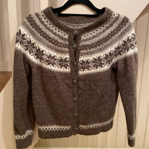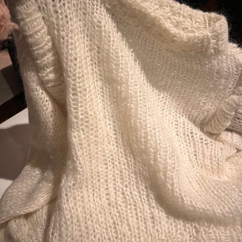 Genseren er strikket i str small i orginalgarnet Lieve fra Mondial. 90% Kid Mohair. Garnet kostet 1050kr.
