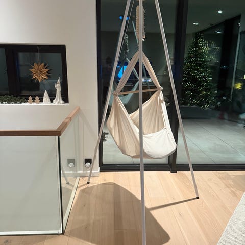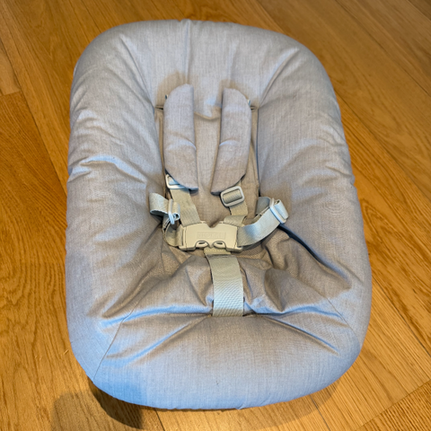 Komplett Leander vugge, pent brukt med madrass, stativ og sengehimmel. Vuggen er oval. Ingen anmerkninger. Alltid brukt med bærebag/beskyttelseslaken.