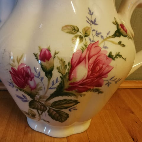 Den store muggen er 23cm høy, mangler et lokk og har et hakk ved tuten, Den mindre muggen er 15cm og har et lite nag øverst, se bilde.