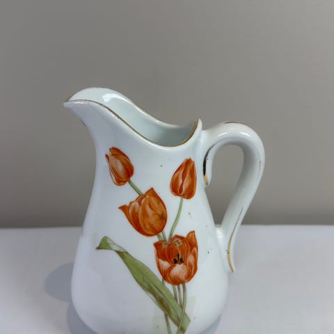 Begge har klassisk rosedekor, håndskrevne produksjonsnumre i bunnen og ingen synlig fabrikkstempel, noe som er vanlig på eldre Porsgrund-gjenstander.
