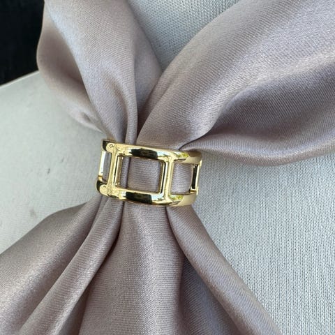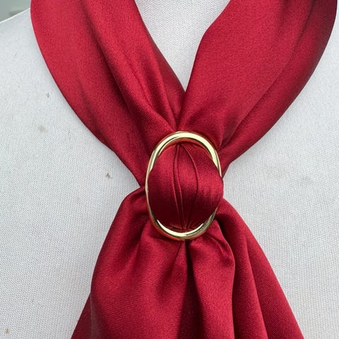 Skjerfring i gull. Passer best til silkeskjerf 65x65cm eller større. Skjerfringen er i metall. Den er pent laget, og ser eksklusiv ut. Passer spesielt godt til silkeskjerf. Kan brukes på andre skjerf også, bare skjerfet ikke er for tykt for hullet i skjerfringen. Åpningen inni ringen er er 20 mm. Ytterkant 30mm. Den er ikke tung slik at den sklir på skjerfet. Har denne i sølv også.