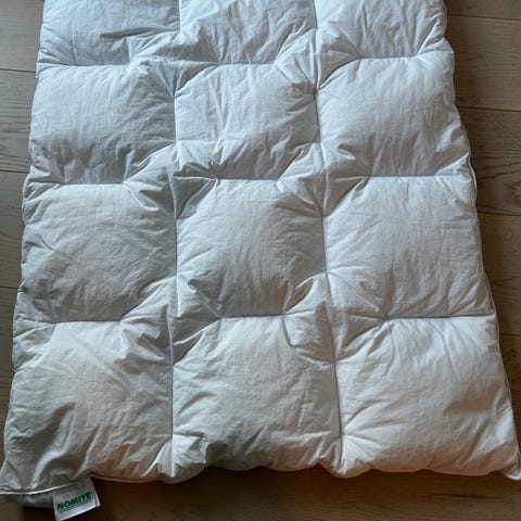 Barnedyne på 100x80 i fiber. 4 sengesett følger med. Mye bruk igjen. Liten flekk på dyne, se bilde.
