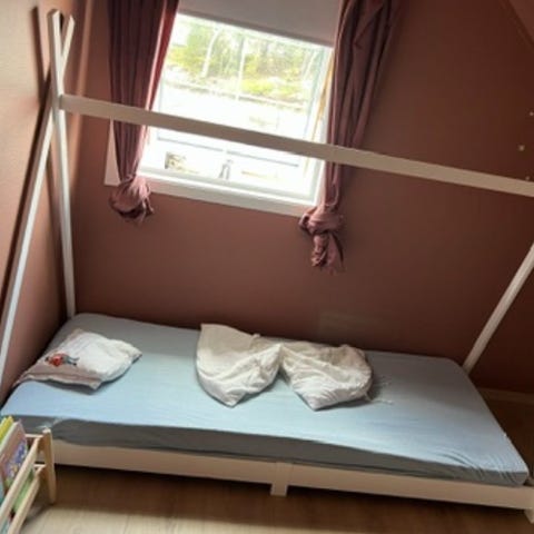 Enkeltsengen har en ramme med husformet design og er egnet for barn. Den er laget av tremateriale og har rekkverk på sidene for sikkerhet.