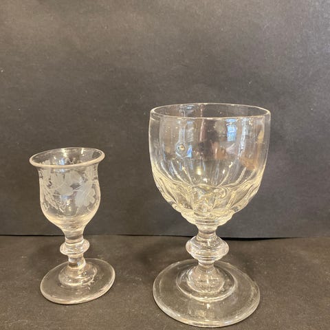 Selger to fine vinglass i pressglass fra Høvik glassverk. Sjelfulle gamle glass uten skader. Selges samlet for kr 250,-