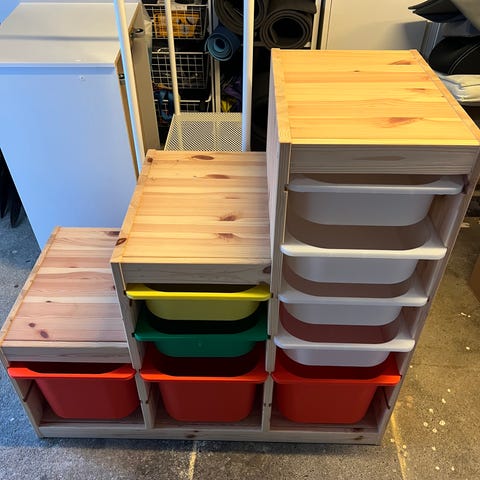IKEA Trofast oppbevaringshylle med kasser. Egnet for organisering og oppbevaring av barneleker eller annet smått utstyr.
