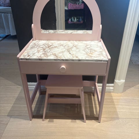 Pent brukt sminkebord med Frost-karakterene, med skuffe. Når man trykker på det rosa hjertet kommer det musikk og Elsa og Anna dukker opp i speilet💕