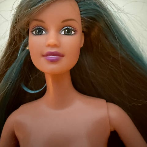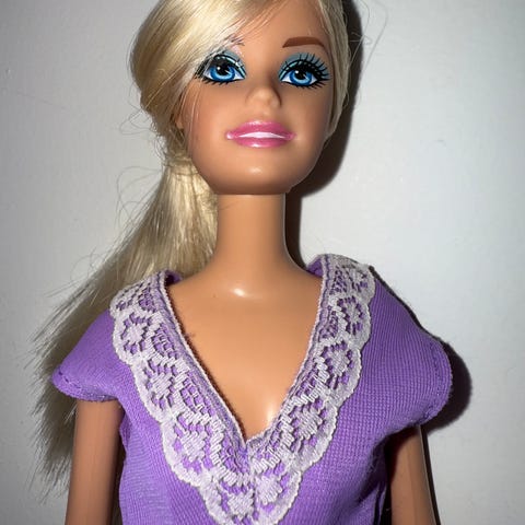 Barbiedukke med langt brunt hår og pannelugg, iført en lilla kjole med glitrende detaljer og medfølgende lilla veske og sko, Motedukke som er klar for catwalken.